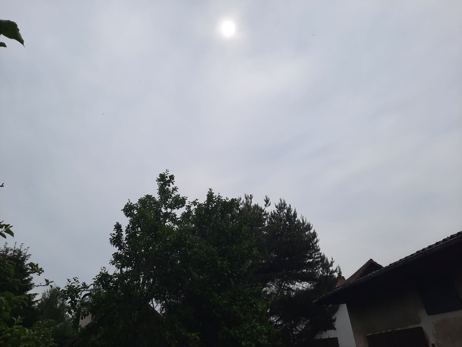 Vysoká oblačnost, teplo, pořád fouká slabý vítr, v nárazech silněji. Opět je vidět na obloze zákal plus ještě vysoká oblačnost.