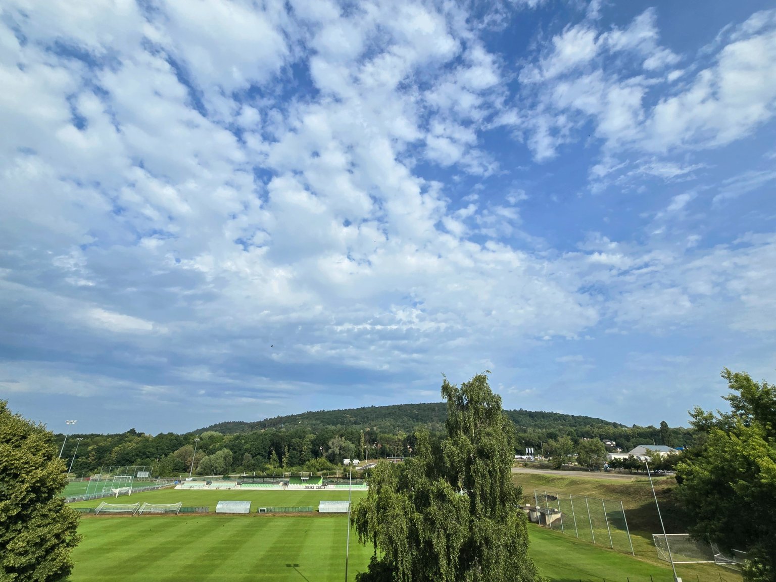 Oblačno až polojasno. Rosný bod 16°C Na ukázku ranní slabý shelf s bleskem na SZ Čech.