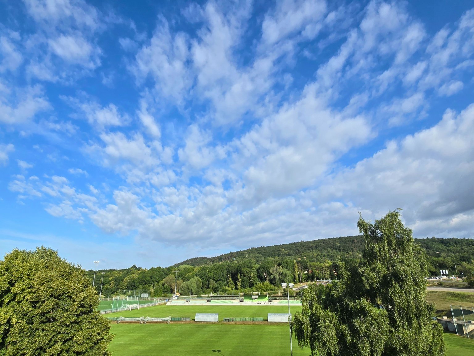 Oblačno, hezky, venku pocitově tak akorát. Pole žloutne, vzdálený vlak.