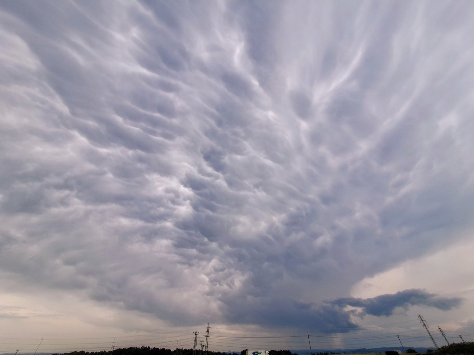 Zataženo, pořád máme tropickou teplotu. Vítr slabý až mírný. Zatáhlo se zřejmě kvůli systému, který právě zasahuje hlavně jih Moravy. Od Litovle je takové černo, že to vypadá, jako kdyby systém už byl tu, ale je to zatím pouze oblačnost systému.