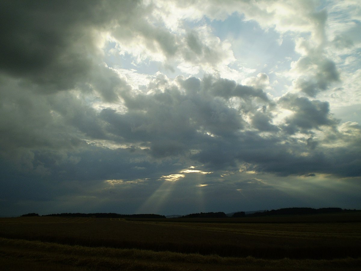skoro zataženo, vzdálená bouřka (beze srážek) "Každou chvíli přijde bouřka s pořádným ceďákem. Konečně se lépe dýchá. Od Ústí se blíží další silná bouřka, vytvořily se i duhy (viz foto)."