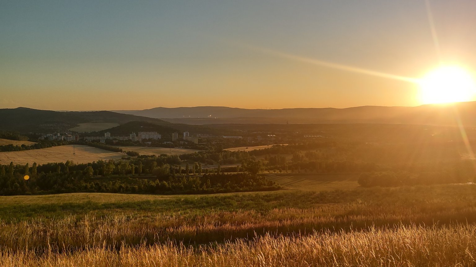 Jasno, pořád je ještě celkem teplo, ale už ne tak výrazně. Vítr mírný až vánek. Na obloze svítí jak zapadající slunko, tak i vylézající měsíc.