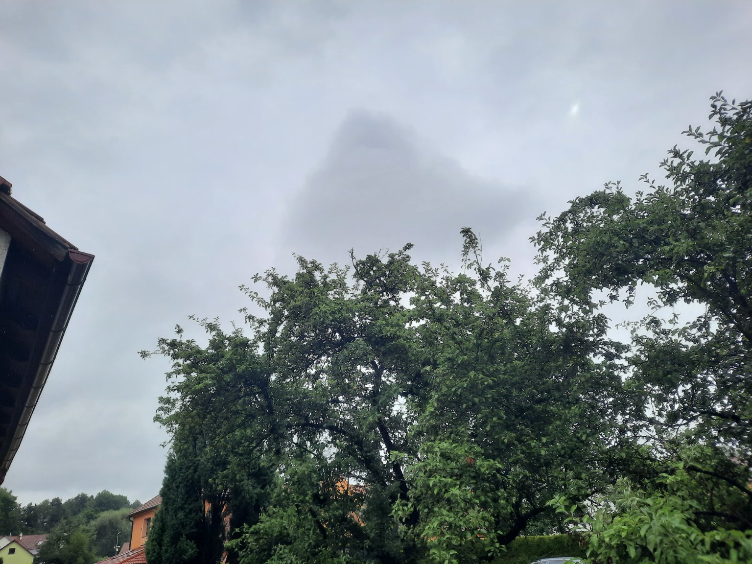 Prší, ochladilo se, vítr mírný. Kapky na skle.