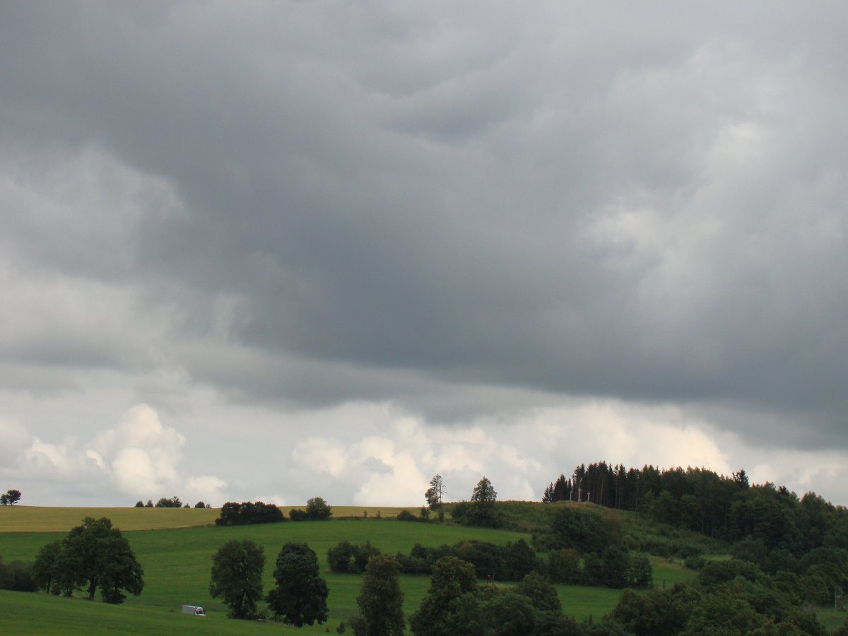 Mraky se pomalu roztrhavaji. Z okna dohled na Praded i Lysou. Vitr 2 m/s
