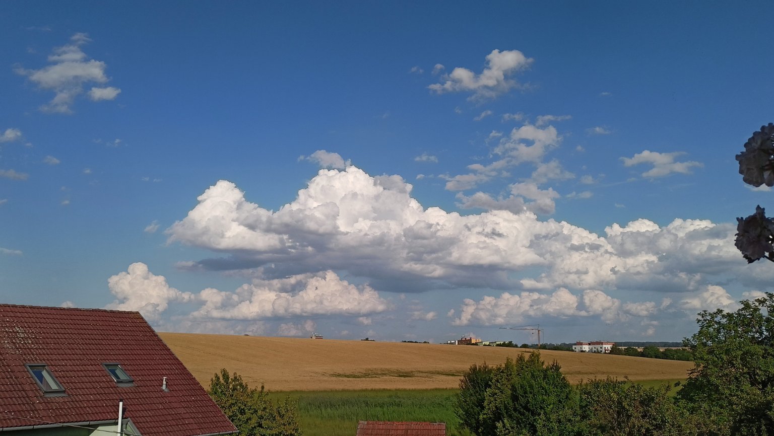 Polojasno, vyfocena vzdálená přeháňka u Litovle. Bouřka u Blanska je ještě zatím daleko.