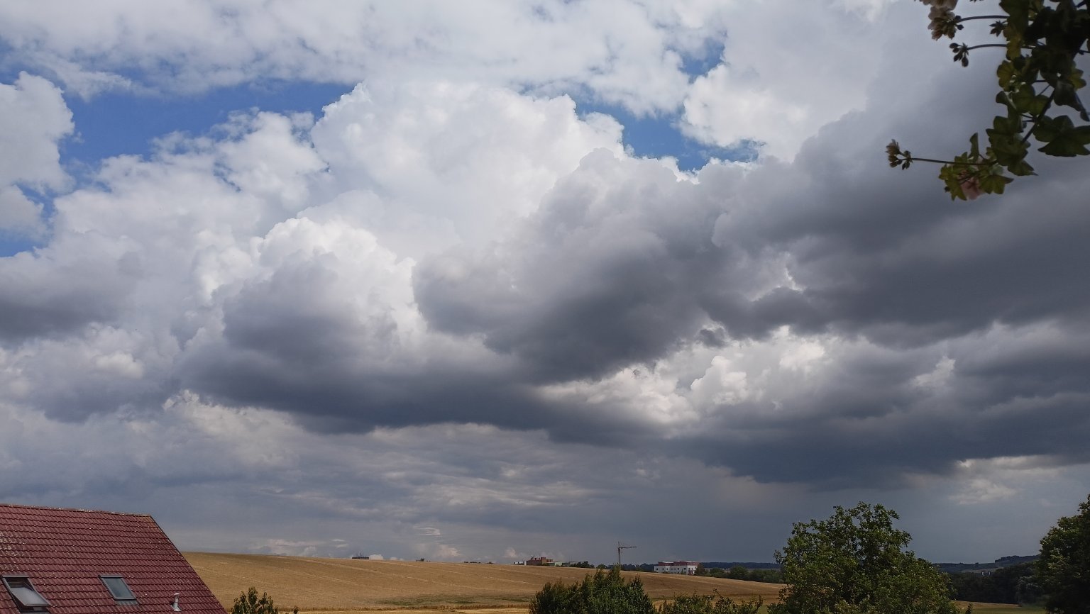 17,5°C, Zataženo až oblačno. V dálce přehaňka, tu až na pár kapek furt nic...
