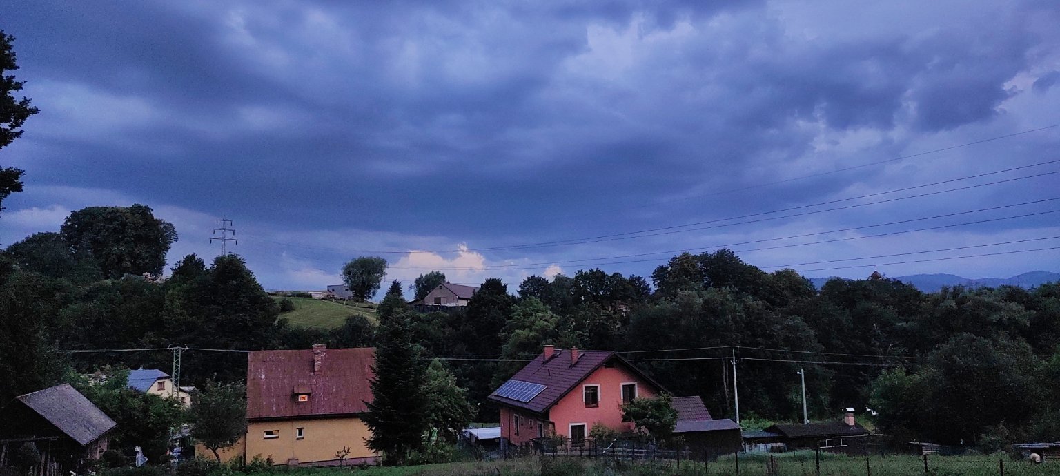 Vzdálená bouřka, opět dost hřmí a blýská se. Viditelný je taky shelf cloud.