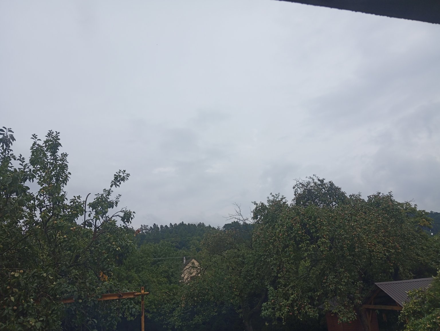 Oblačno až zataženo, pohled na přeháňku jižně od nás.