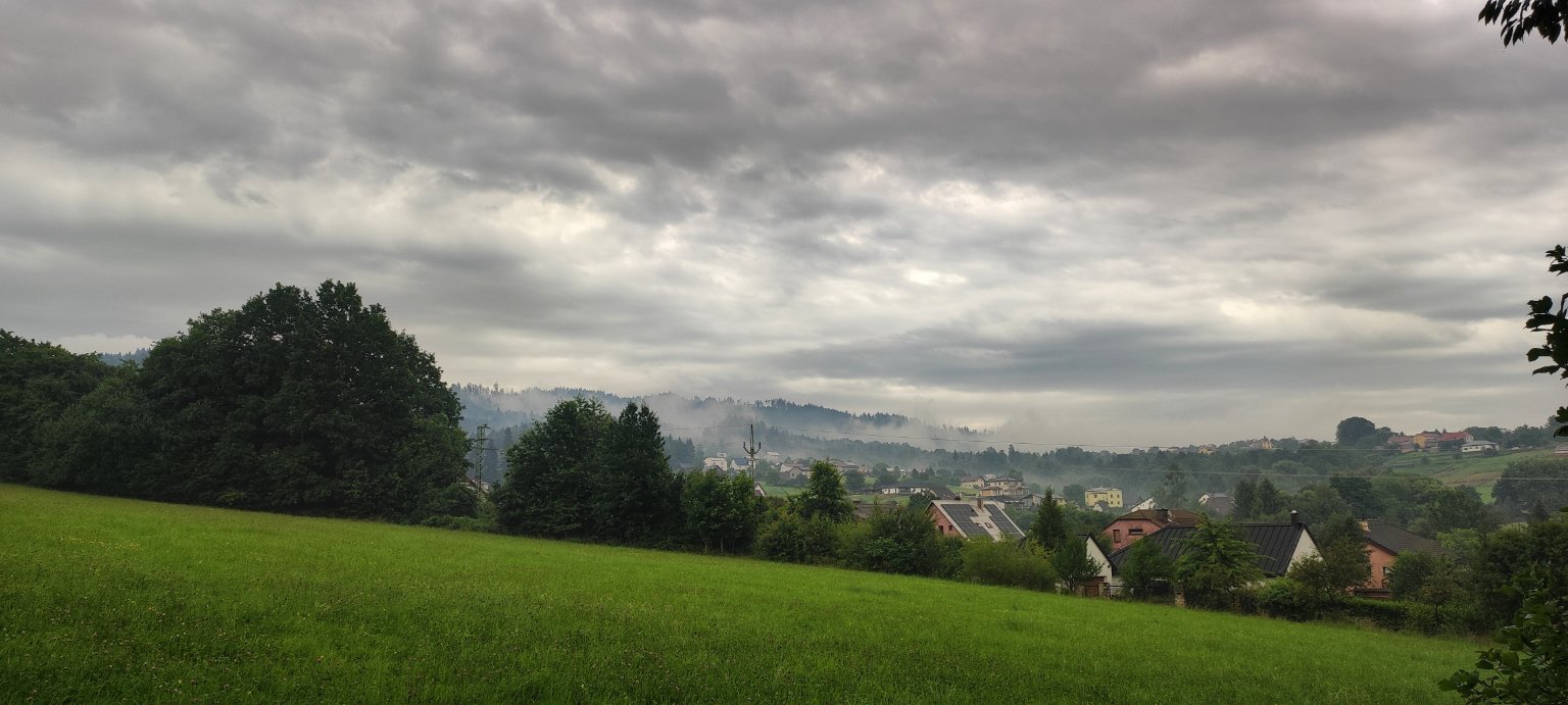 Oblačno až zataženo, pohled na přeháňku severozápadně od nás.