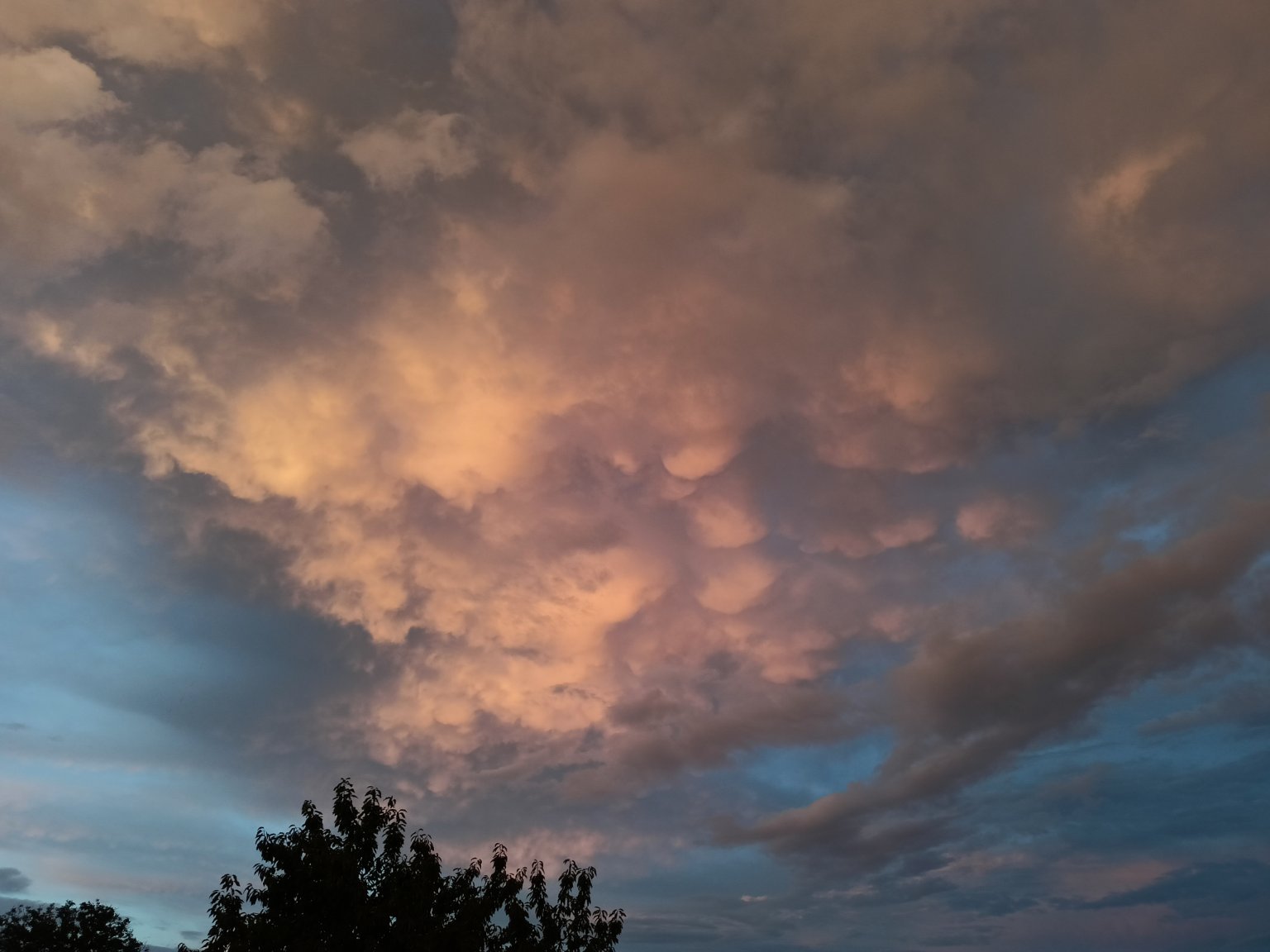 Oblačno až skoro zataženo, je po přeháňce. Krásné růžové kupovité mraky.