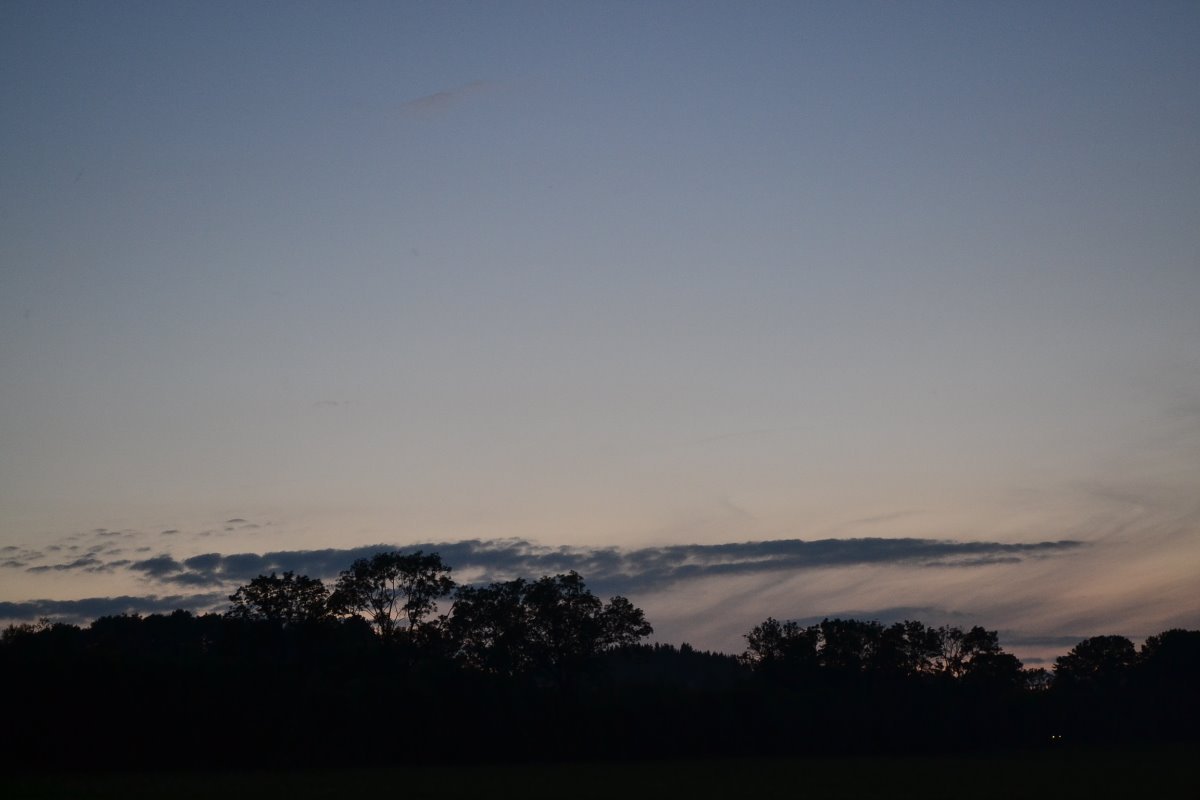 Skoro jasno, bezvětří, krásný večer a západ slunce.
