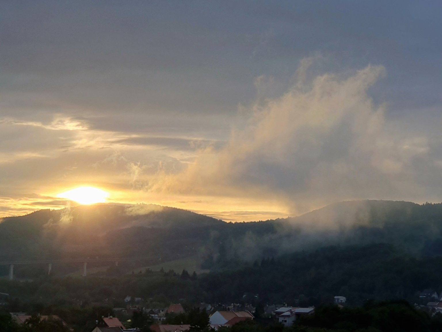 Skoro jasno, na jihozápadě i větší oblaka ale ne kupy. Vánek nebo slabý teplý vítr (škody minimální, plno listí i zelené, plech převrácený a jedna zlomená větší větev)