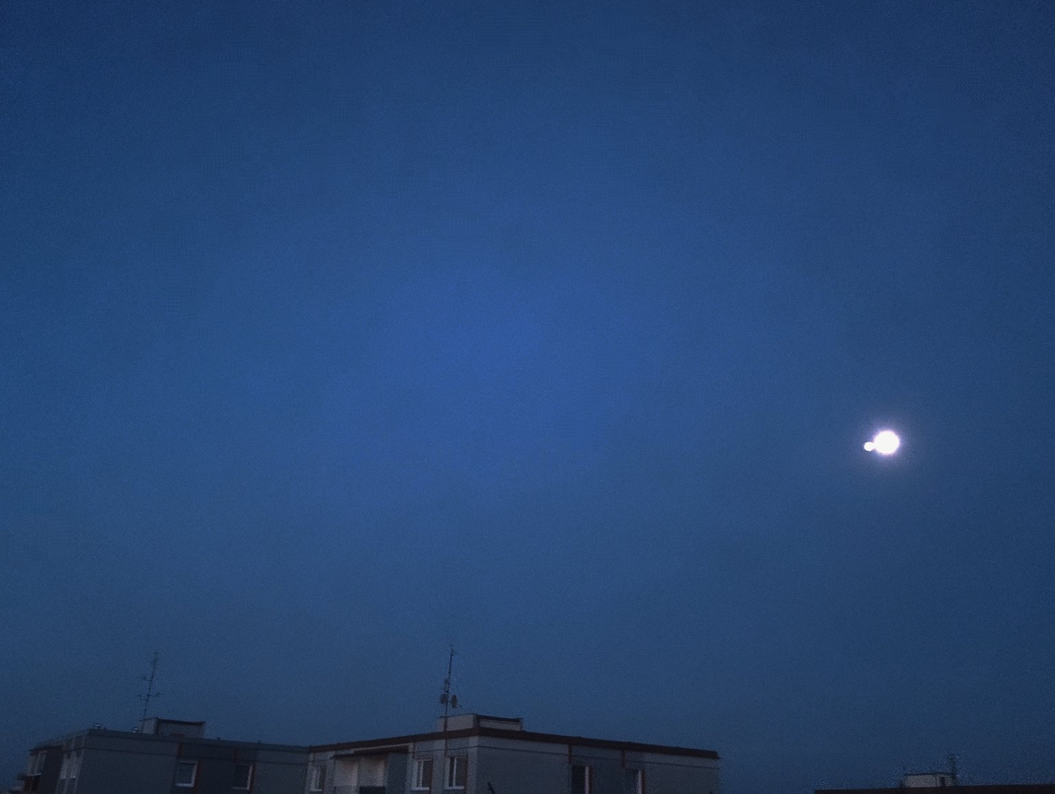 13,5°C, Oblačno. Celkem teplé ráno, dneska je měsic ještě vysoko a v dálce se sem opět nasouvá Stratus... V Těšině je stejně jako včera...