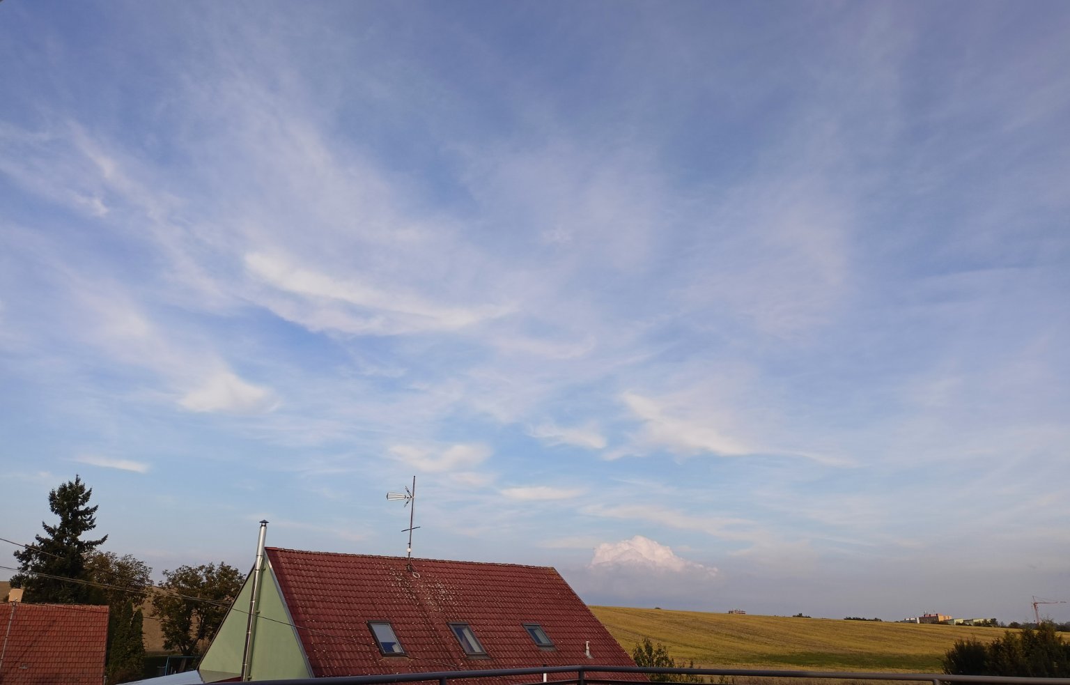 Zrak k obloze jsem byl přinucen zvednout kvůli hluku letadla. Bylo to letadlo Antonov an 12 BK společnosti Motor Sich Airlines. Na fotce malinká tečka.