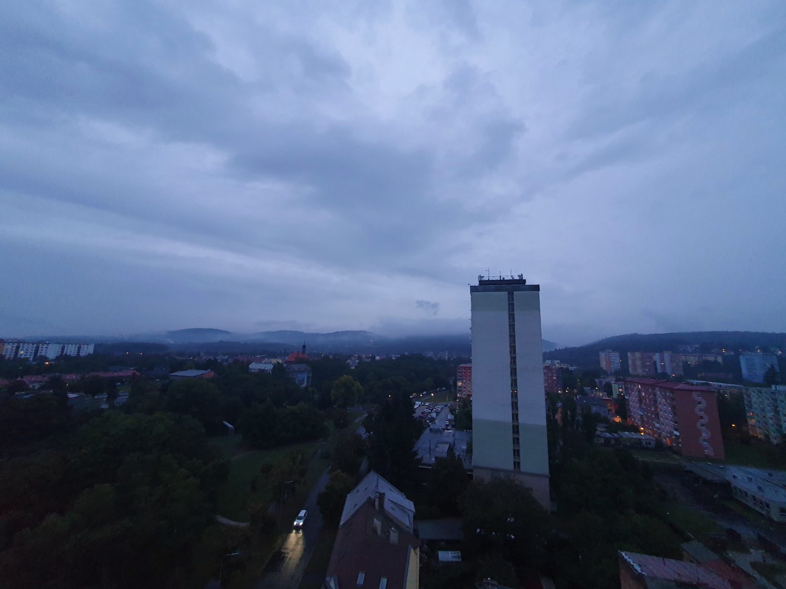 18,2°C, Zanedbatelný až velmi slabý dešť. Byli jsme v suché mezeře, ale už pomalinku odchází a pomalinku začina opět pršet..