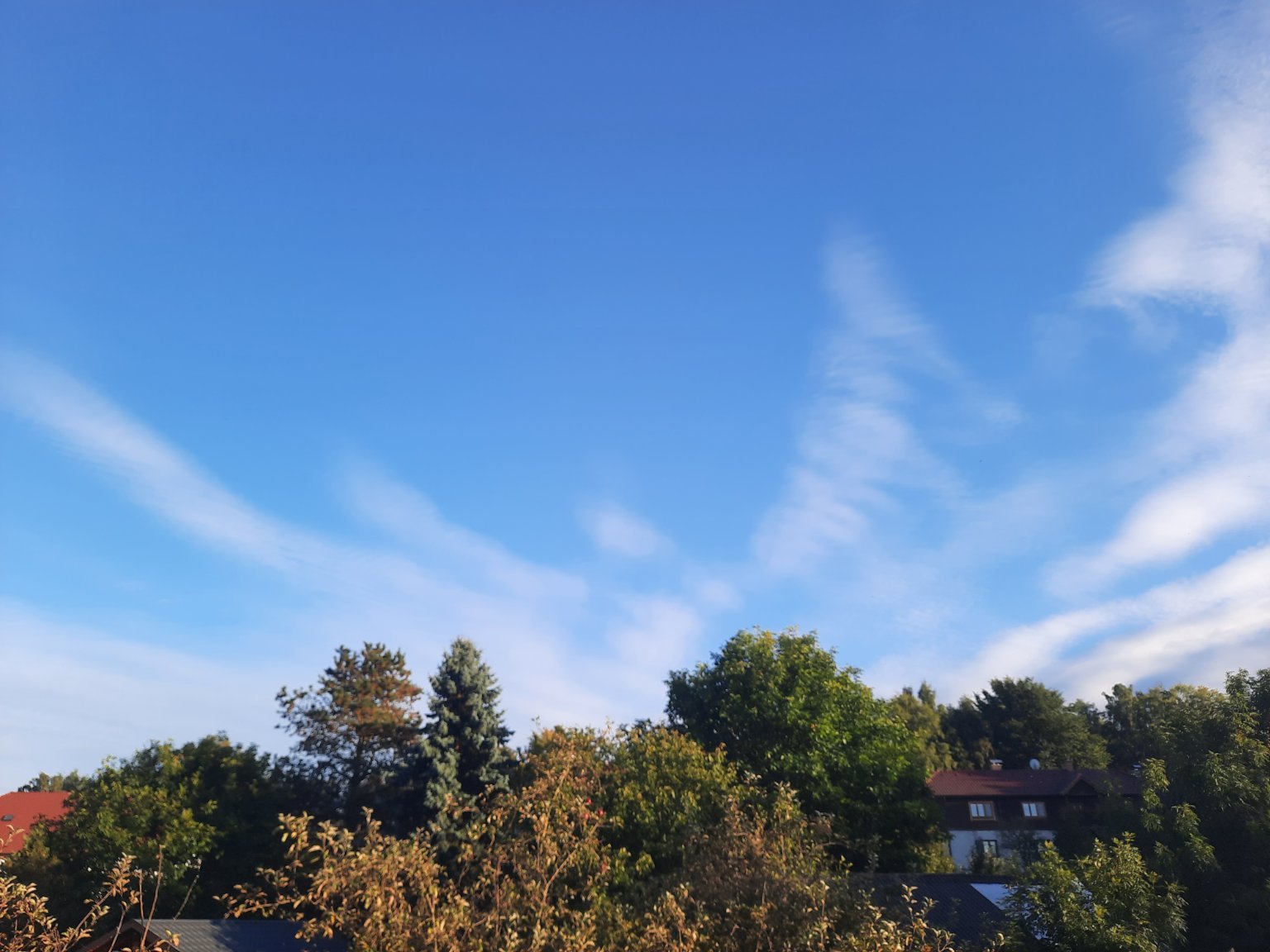 Polojasno až skoro jasno a kupky. Vánek (vysoká oblačnost ubyla, teď jsou malé kupy)