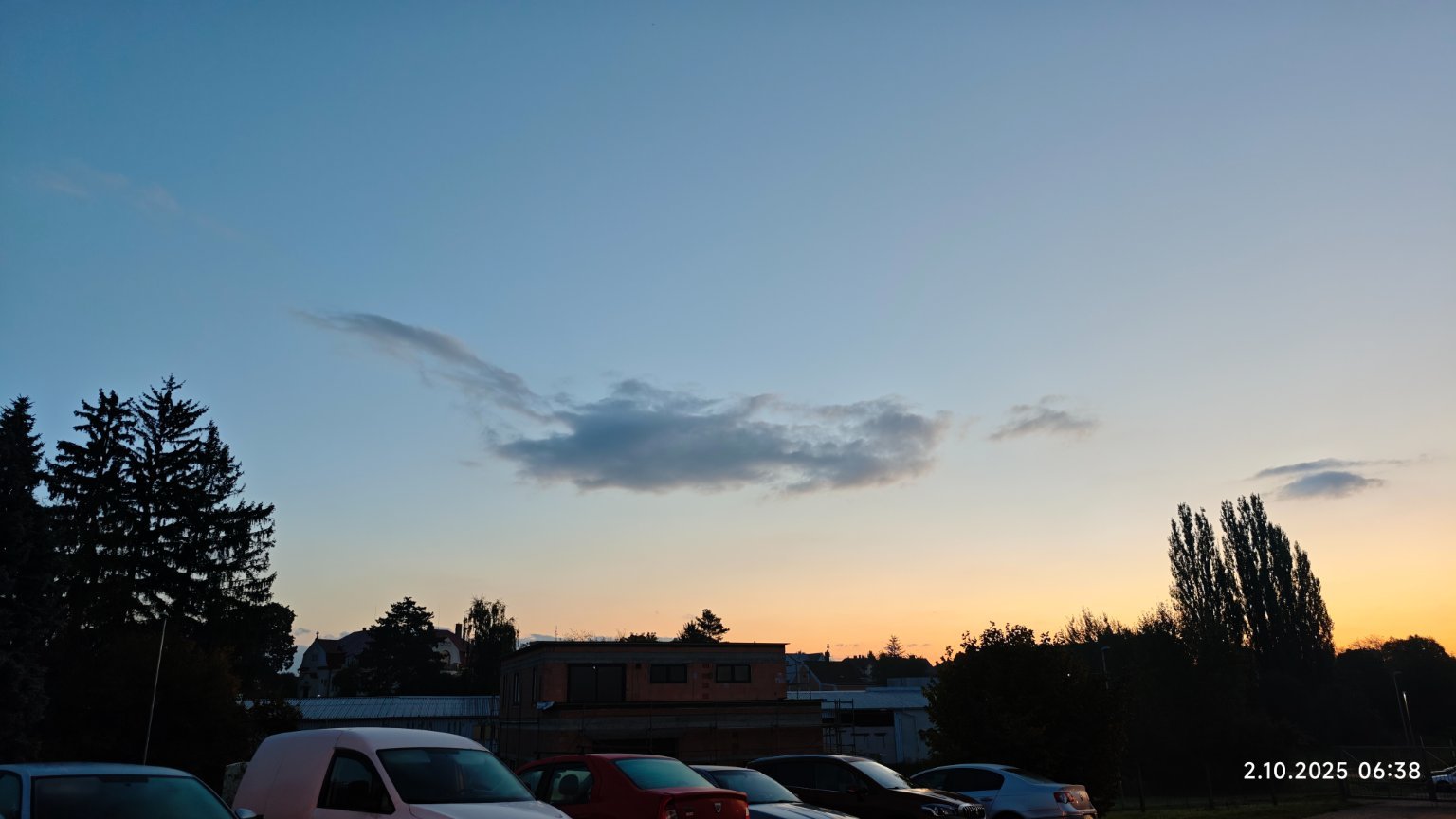 Skoro jasno. Bezvětří (teplota 4,3°C a ještě trochu klesá. Na trávě je slabý přízemní mráz)