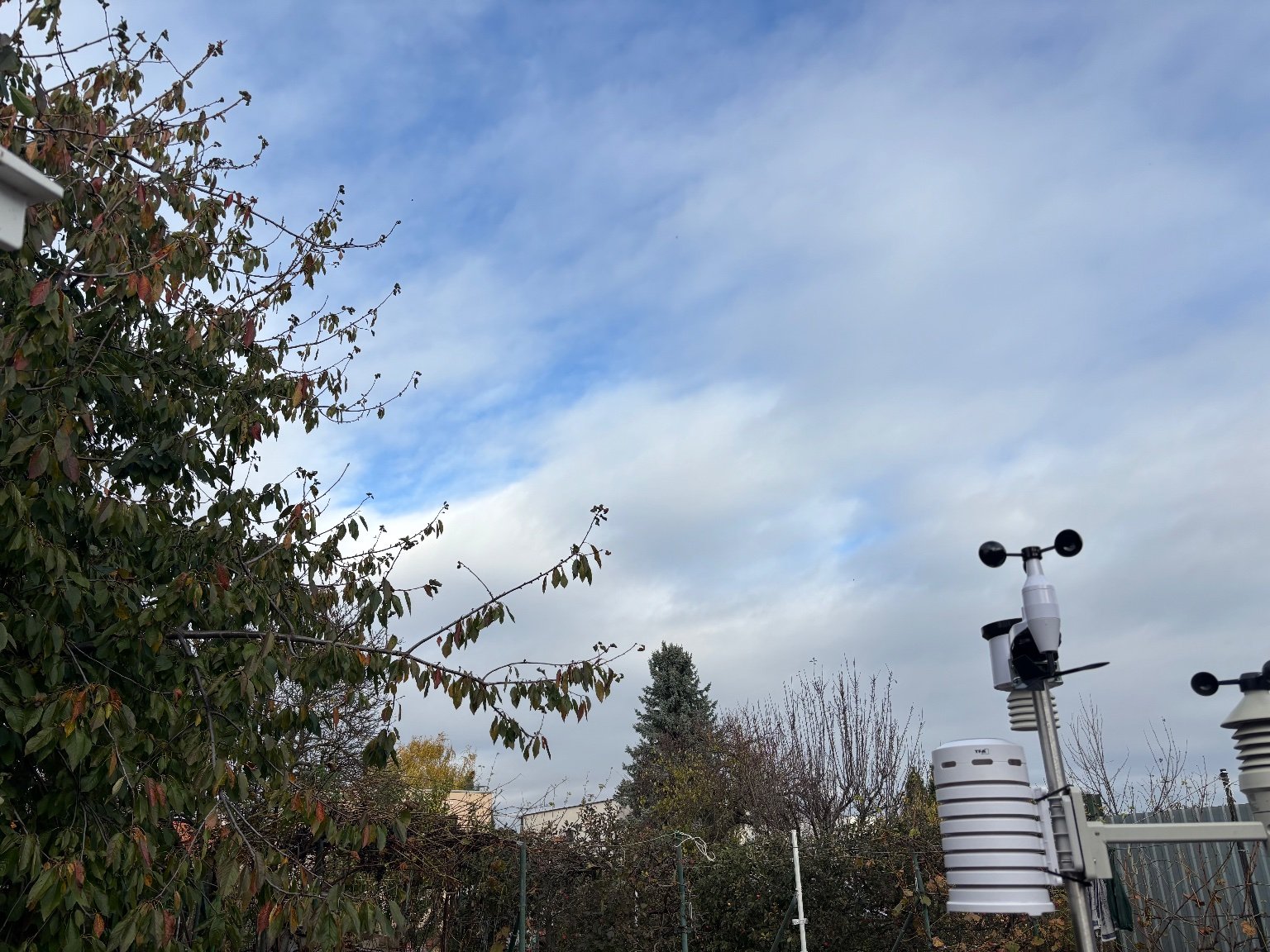 Tlak 994.8 hPa / vlhkost 99%/ V vítr 6.1/7.2km/h / srážky 0.3mm/ solární záření 31.0 W/M2.