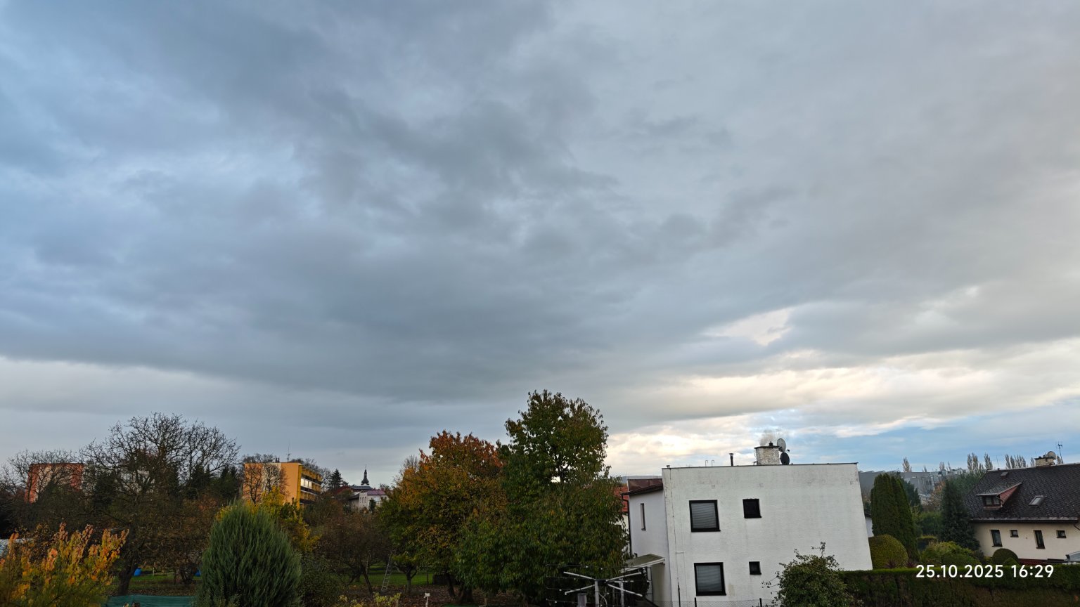 po slabé dešťové přeháňce se oblačnost částečně protrhává, 9°C