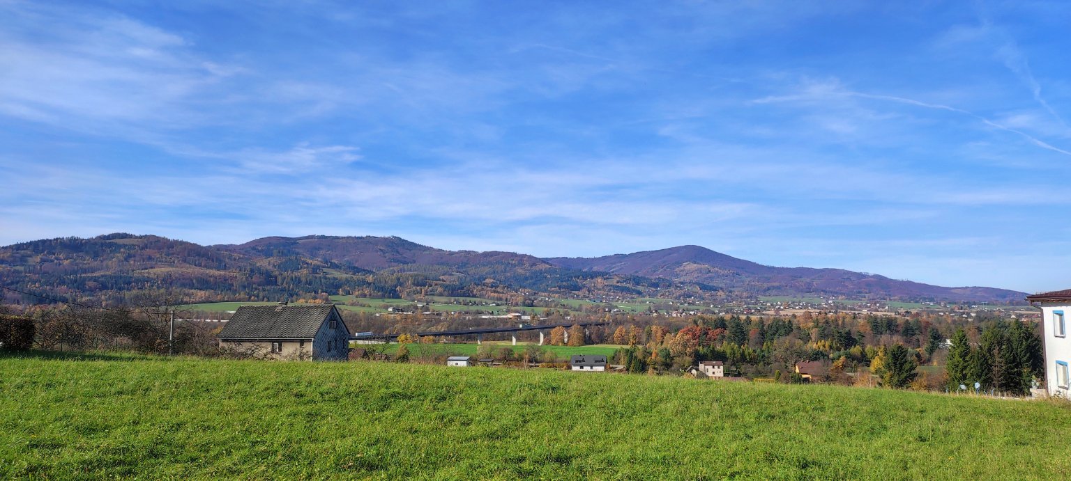 11,7°C, Oblačno. Vysoké oblačnosti přibývá, ale jinak je fakt příjemně a hezký. Podzimní výhled na obec Písek a polský kopec Ochodzita.