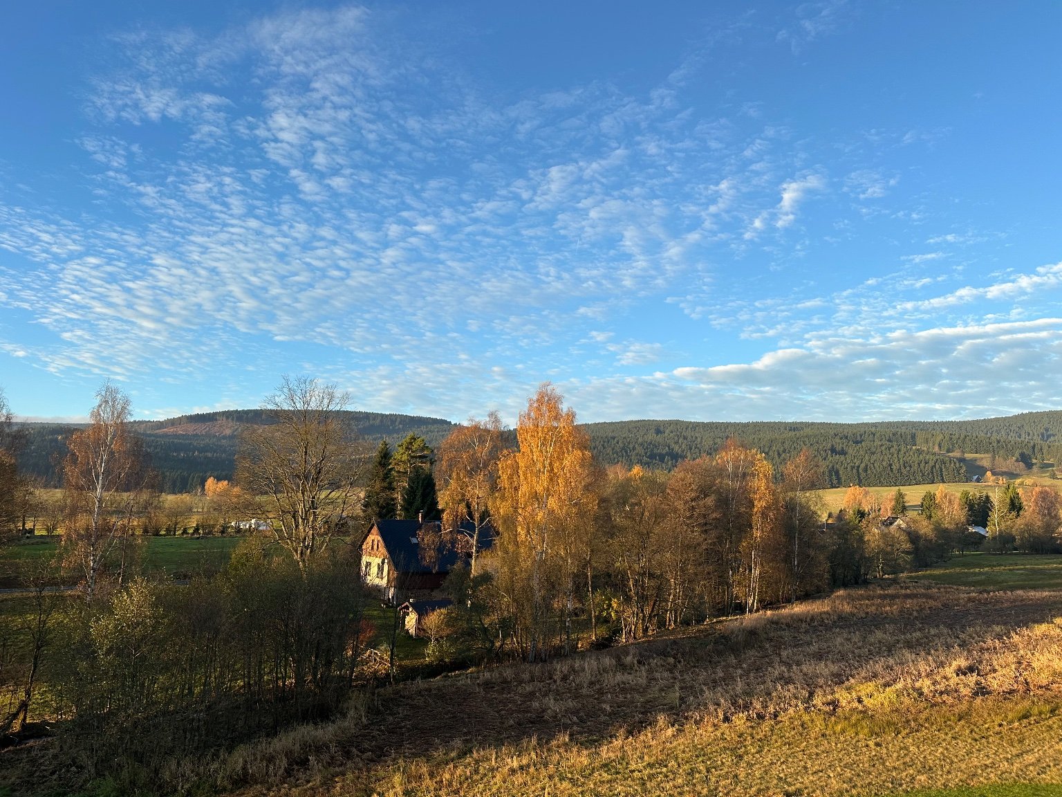 Skoro jasno, klidno, tlak 1020 hPa.
