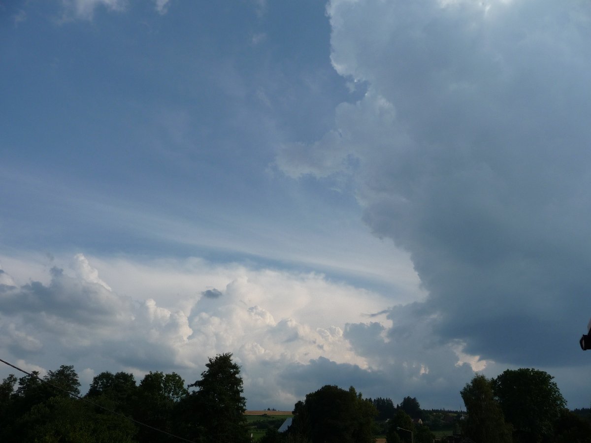 Asi před hodinou a půl k nám přicházela hrozivě vypadající bouřka. Pode radaru se nejednalo o nic vyjímečného, vypadalo to však zcela jinak. Tak jsemm si vyrazil a podařilo se mi vyfotit aspoň zbytek možná ,,shelfcloudu" nebo snad možná i squall line (podle radaru), dřív byl tento límec zřetelnější a bohužel nebyla možnost, udělat panorama, ani širokoúhlý objektiv. Bouřka začala slábnout dřív, než se začla výrazněji projevovat (u nás), kromě silných nárazů větru, jen normální déšť s průměrnou bleskovou aktivitou. Nyní se přesouvají od východu další aolaka typu Cumulus congestus.