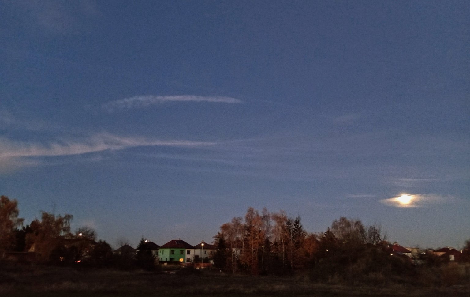Jasno, v dálce mlha, která se trochu žene sem. Superúplněk (také největší v tomto roce).