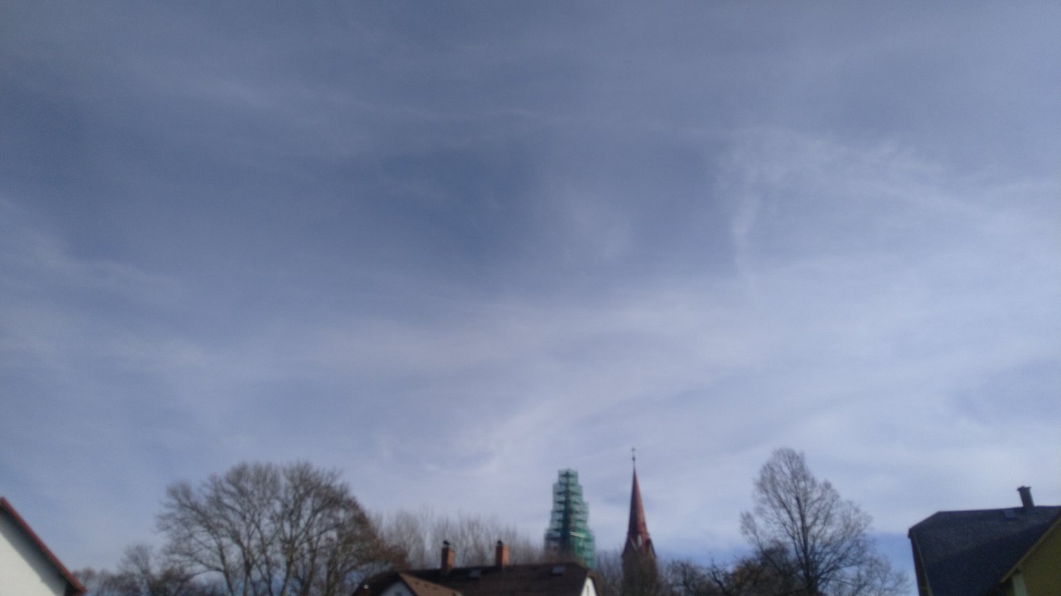 Polojasno s převažující vysokou oblačností, velmi slabý J. vítr, tlak 1021,4 hPa.