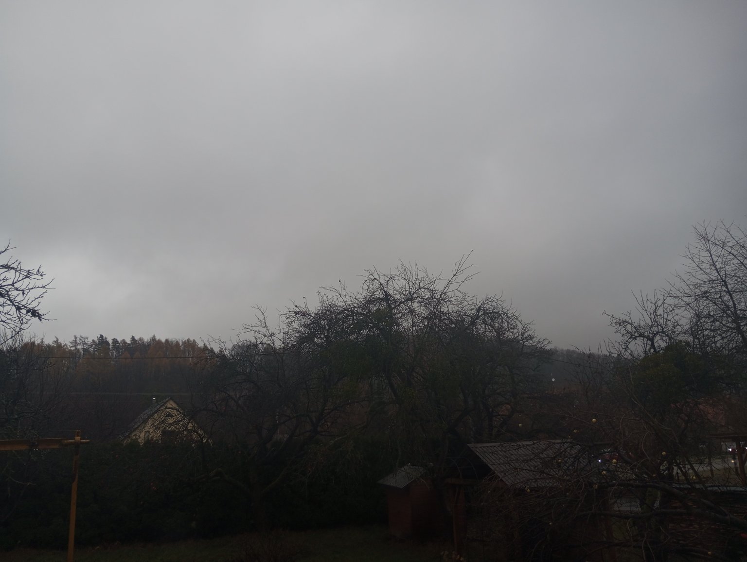 Zataženo s trvalým slabým až mírným deštěm. Zatím spadlo 7,4mm. Vane slabý jihovýchodní vítr, tlak: 999hPa. Ochlazení od severozápadu zatím nedorazilo, už se ale poměrně rychle blíží.