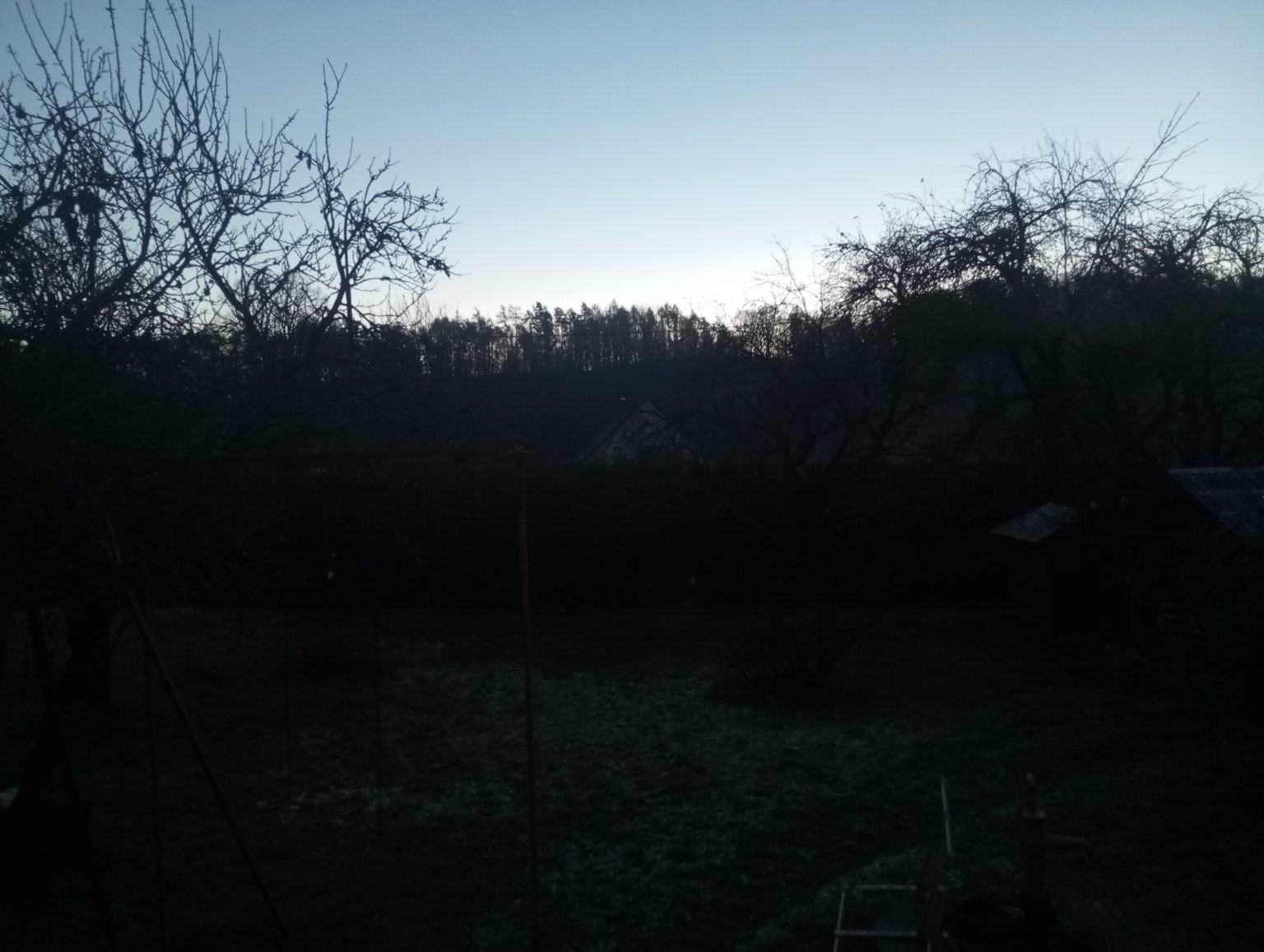 0,1°C, Zataženo až oblačno, Sníh: nesouvislý. V noci bylo bohužel celkem teplo (1,4°C), čimž sníh skoro roztál, už jen na předmětech a u lesa jsou male zbytky, ale aspoň kopce jsou hezky zasněžené