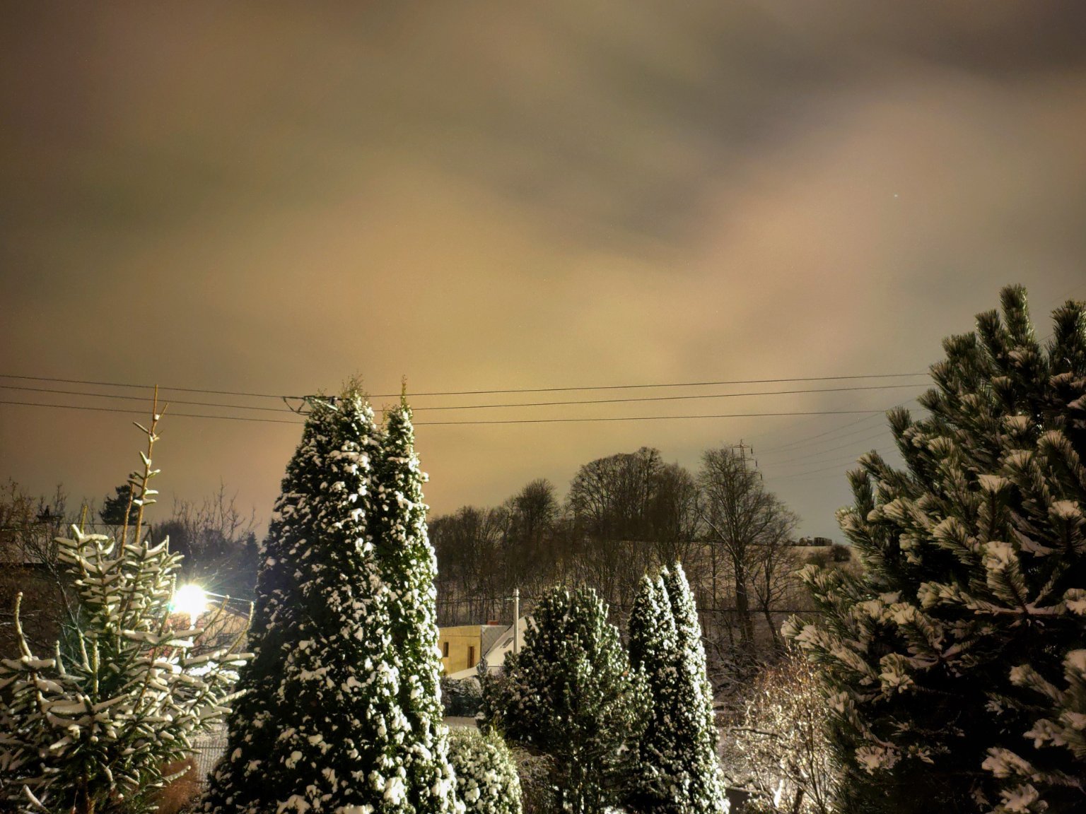 -1,4°C, Slabé až mírné sněžení, Sníh: 4 cm. Už to nad náma začíná vznikat, na cestě už velmi drobný poprašek.