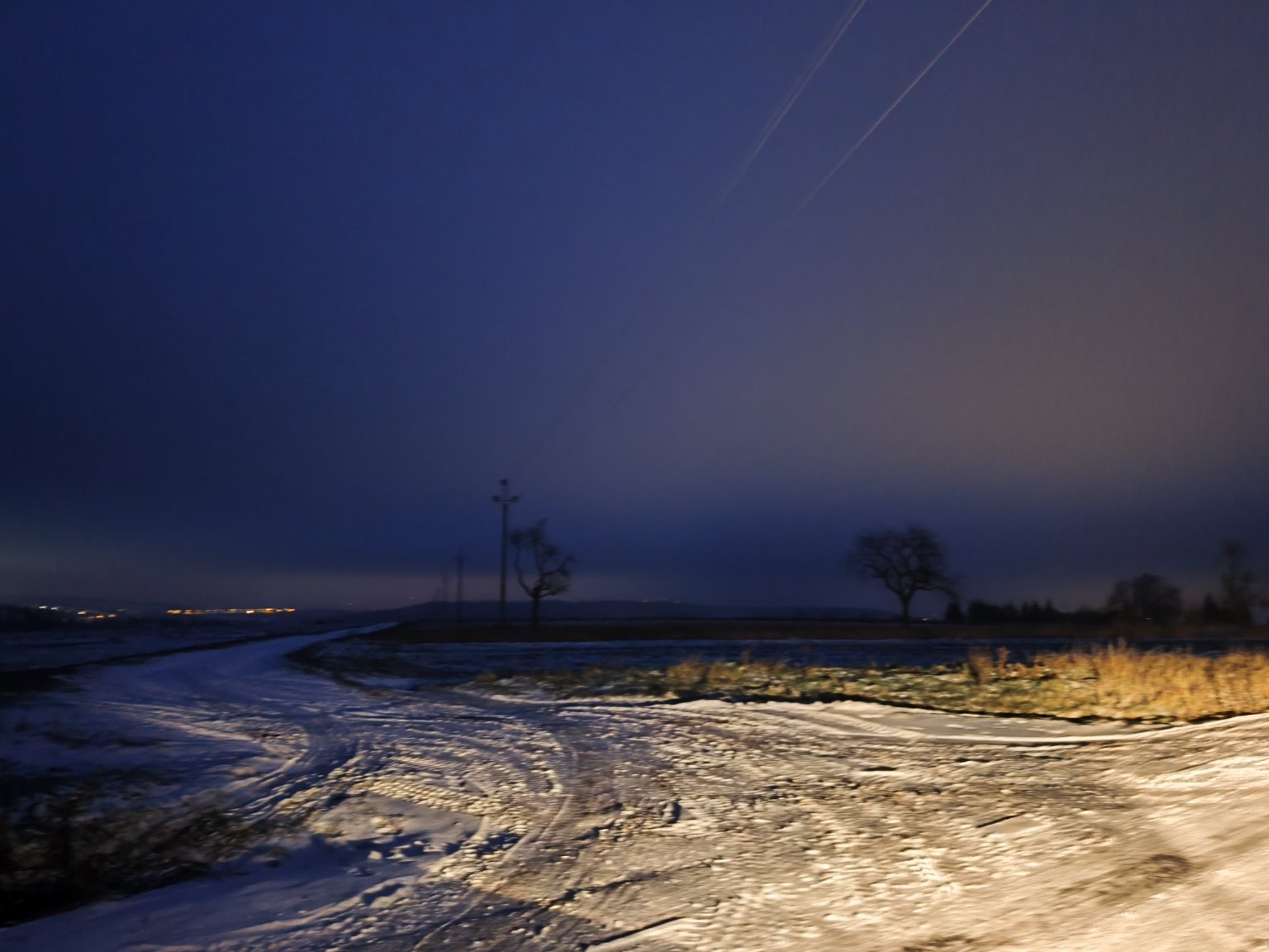 Trvalé mírné sněžení, tlak 1003,4 hPa, jen slabý vítr jižních směrů.