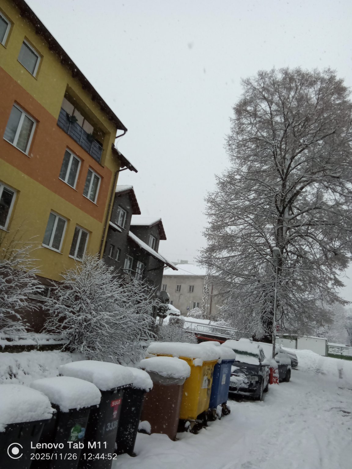 Doznívající sněžení, sněží sice od rána, ale srážky nebyly tak intenzivní a celou dobu byla teplota těsně nad nulou, takže se výrazná sněhová pokrývka nevytvořila, leží jen trocha rozbředlé břečky, která pravděpodobně bude do večera pryč. Vane slabý severozápadní vítr, tlak: 1009hPa.