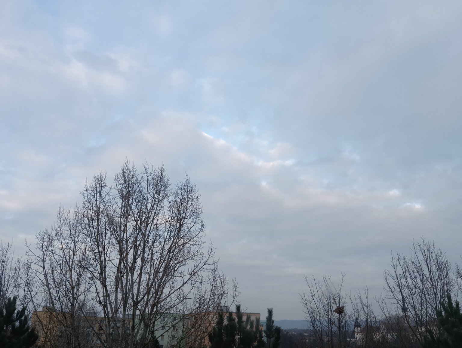 Vánek, chladno a mlhavo. V levé části rybníka zbytek ledu