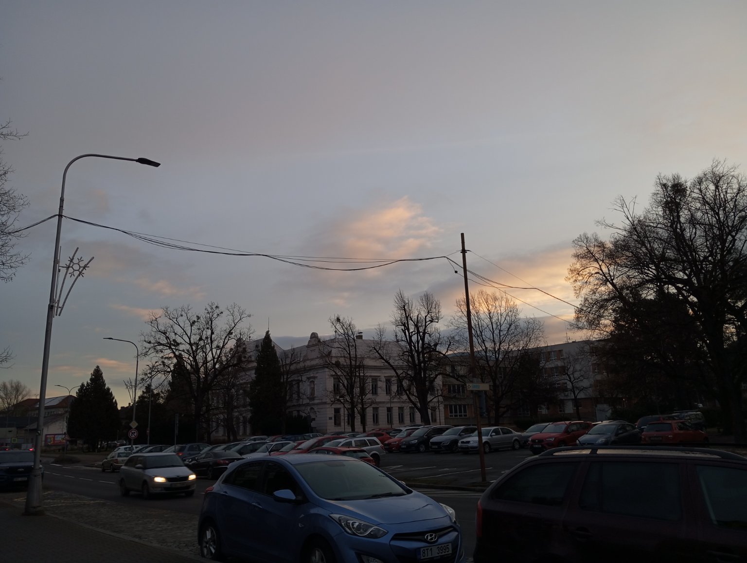 Slabý déšť, mrholení. Tlak 1016,4 hPa. Velmi slabý jižní vítr.