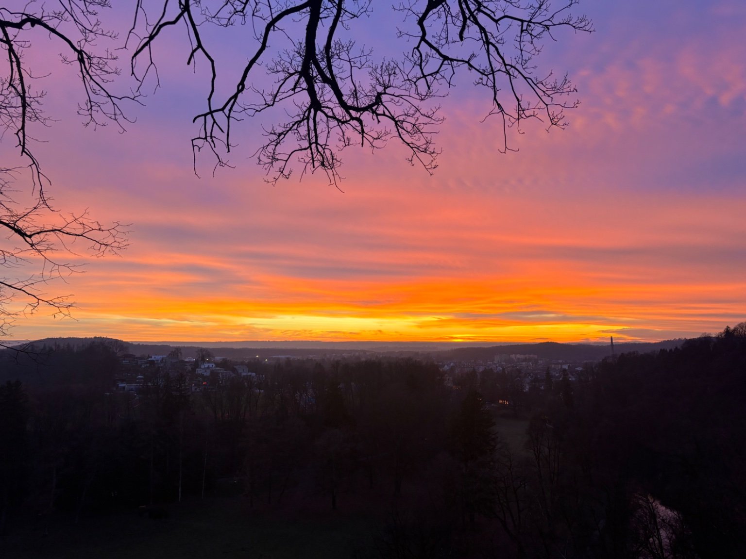 Vysoká oblačnost. Bezvětří (západ slunce. Poslední zbytek sněhu pryč)