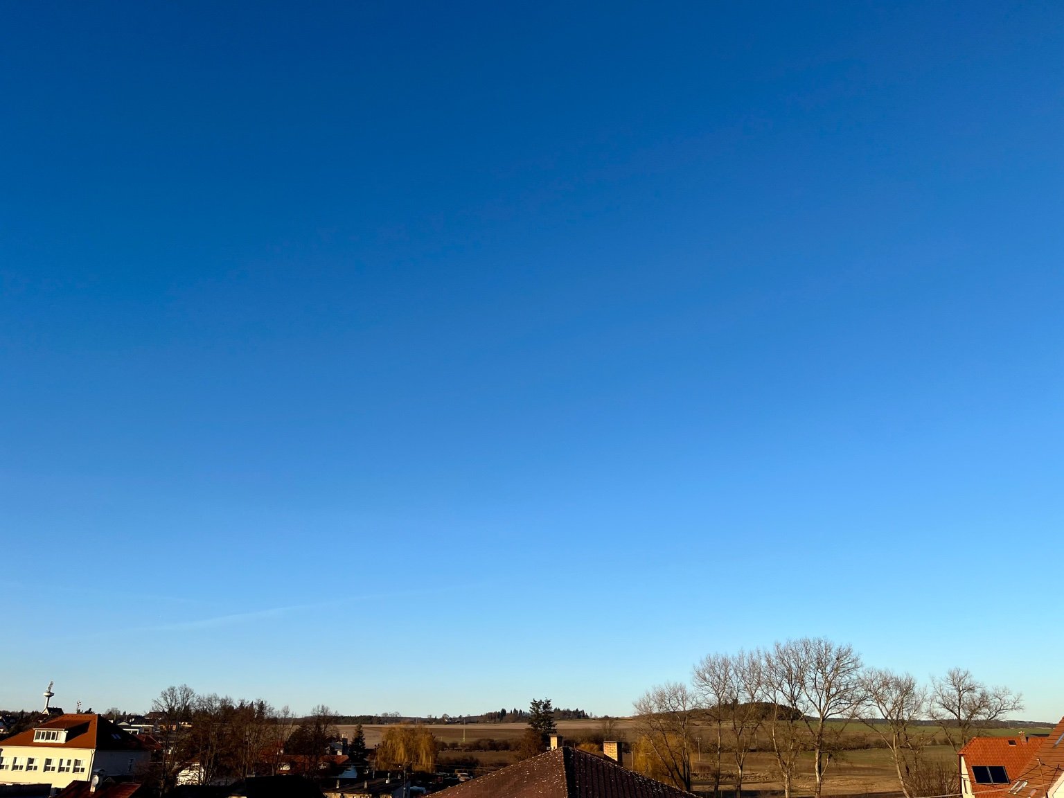 Zataženo. Slabý vítr (poprašek skoro odtal na zahradě, u garáže kde jsou švestky a hrušně tak tam se drží)