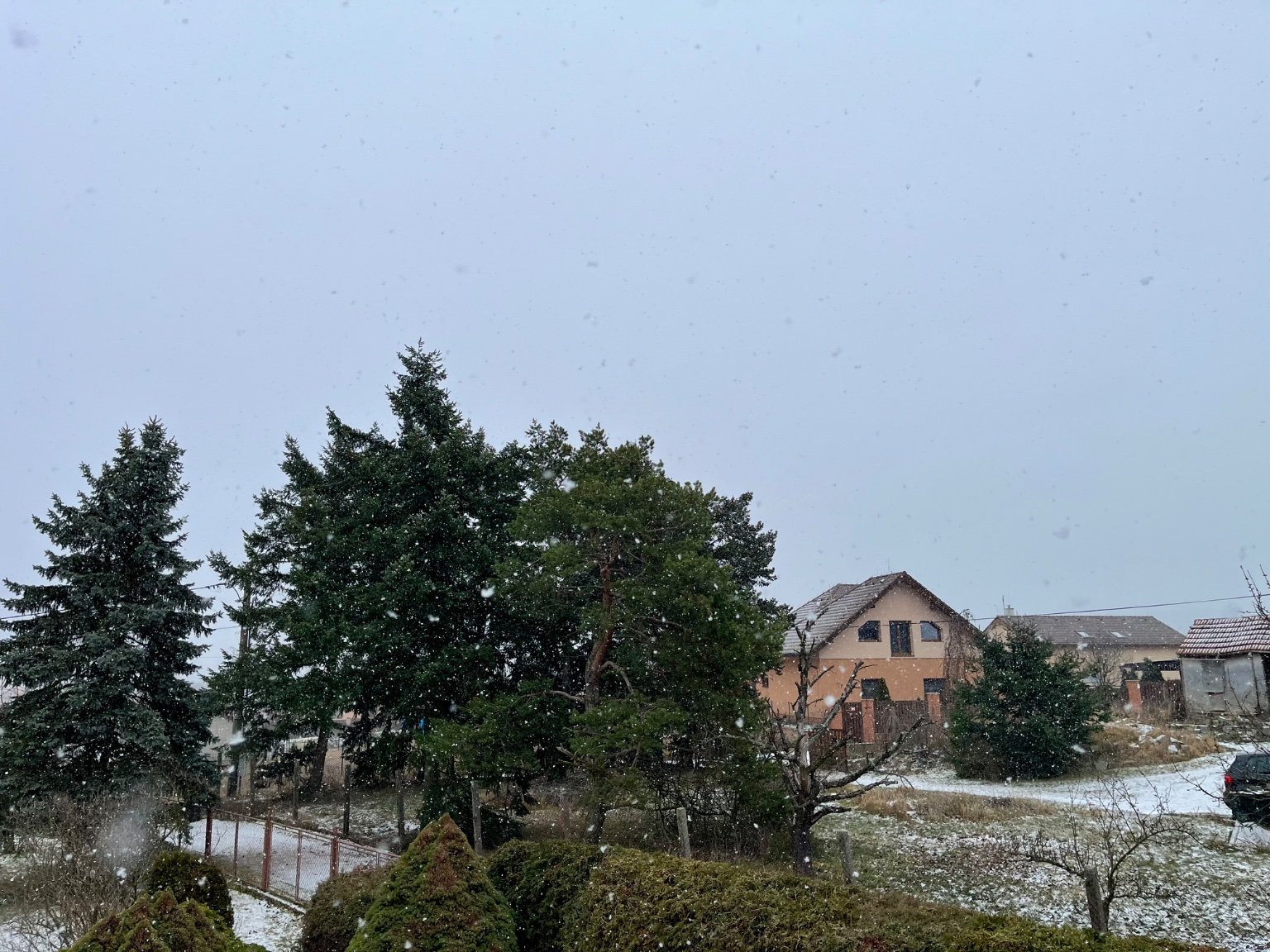 Trvalé mírně sněží, vítr jen slabý západní, tlak 1017 hPa.