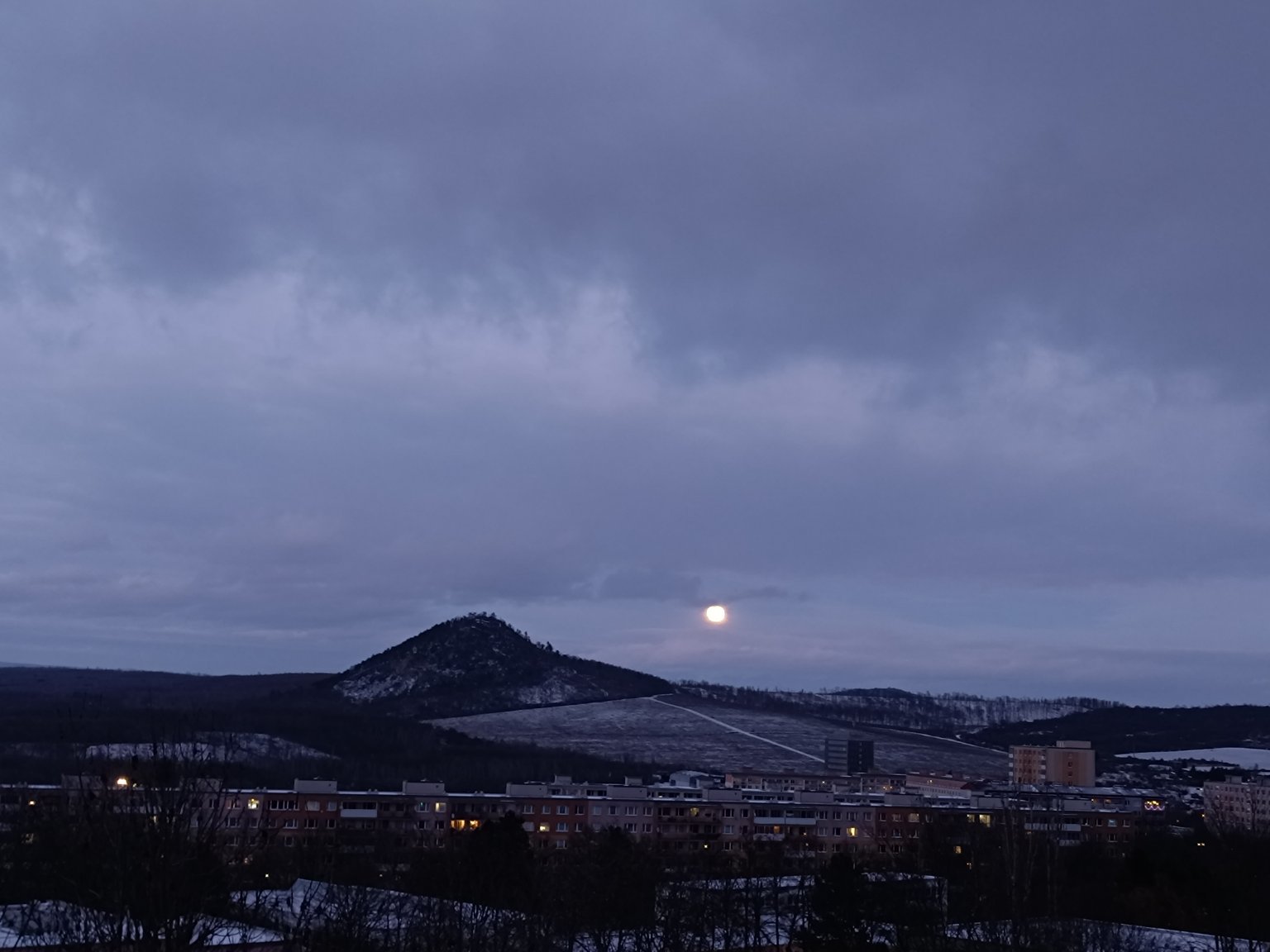 skoro jasno, max. 0.5°C / foto pořízeno před 15h nad městem...