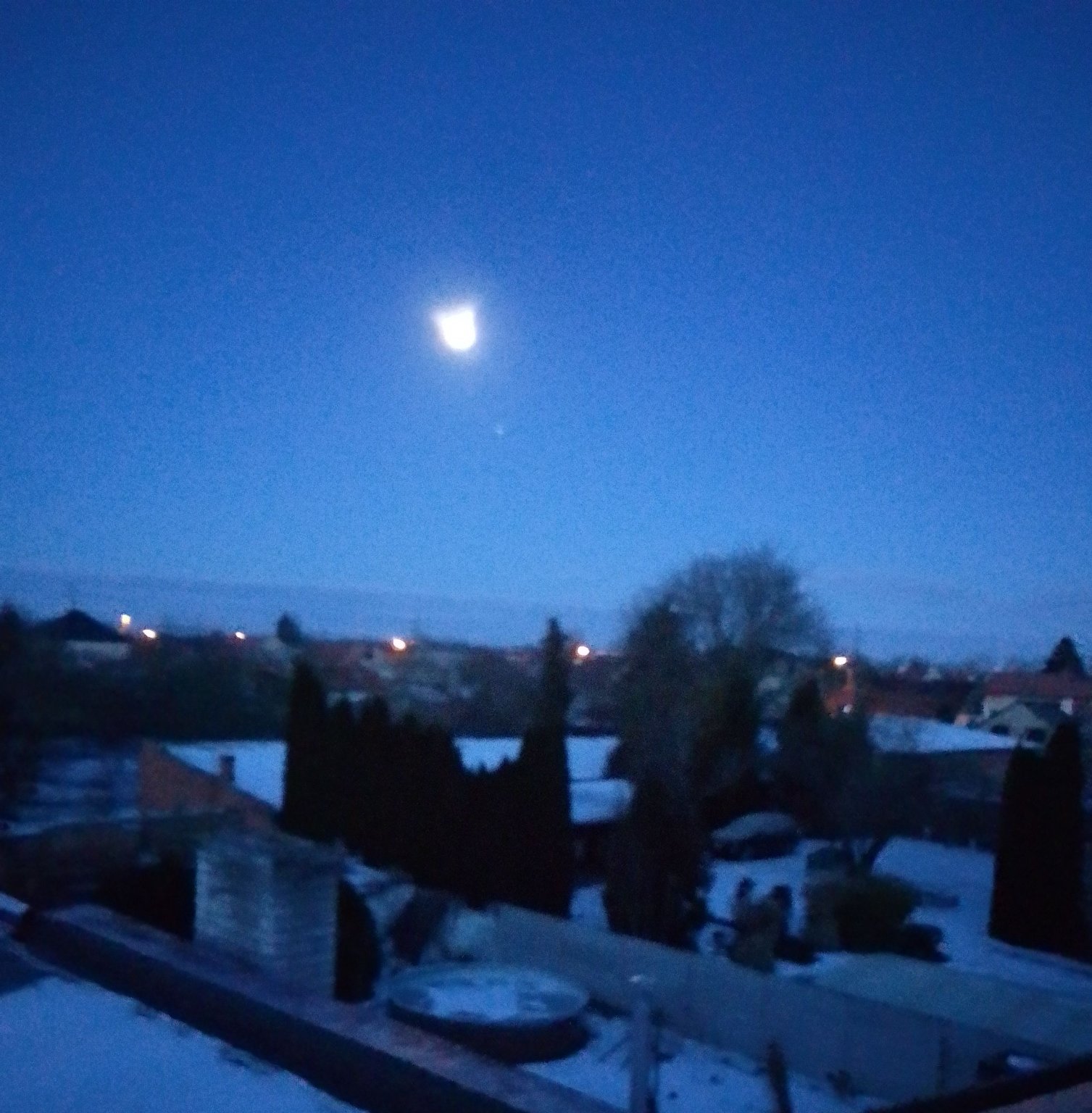 -5,3°C, Skoro jasno, Sníh: 7 cm. Fajně teď začalo mrznout, všecy tu teď kvůli vrstvě sněhu jezdí v protisměru (i fizli), cesta se bude odhrnovat asi až k ránu, teď by to bylo stejně zbytečné když tu je skoro nulový provoz..