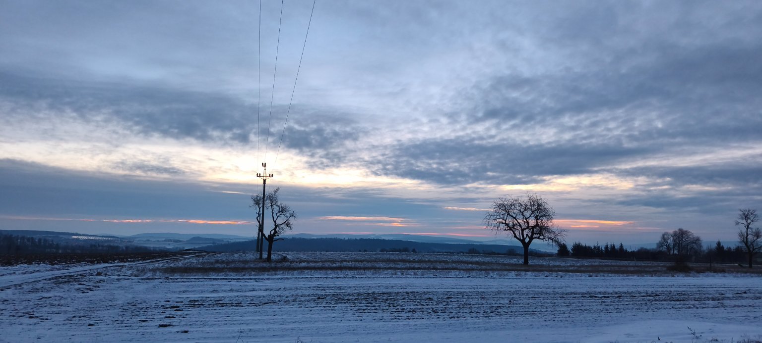 Aktuálně převažuje většinou skoro zataženo až oblačno, sem tam slabounké sněžení, fouká většinou vánek až slabý větřík