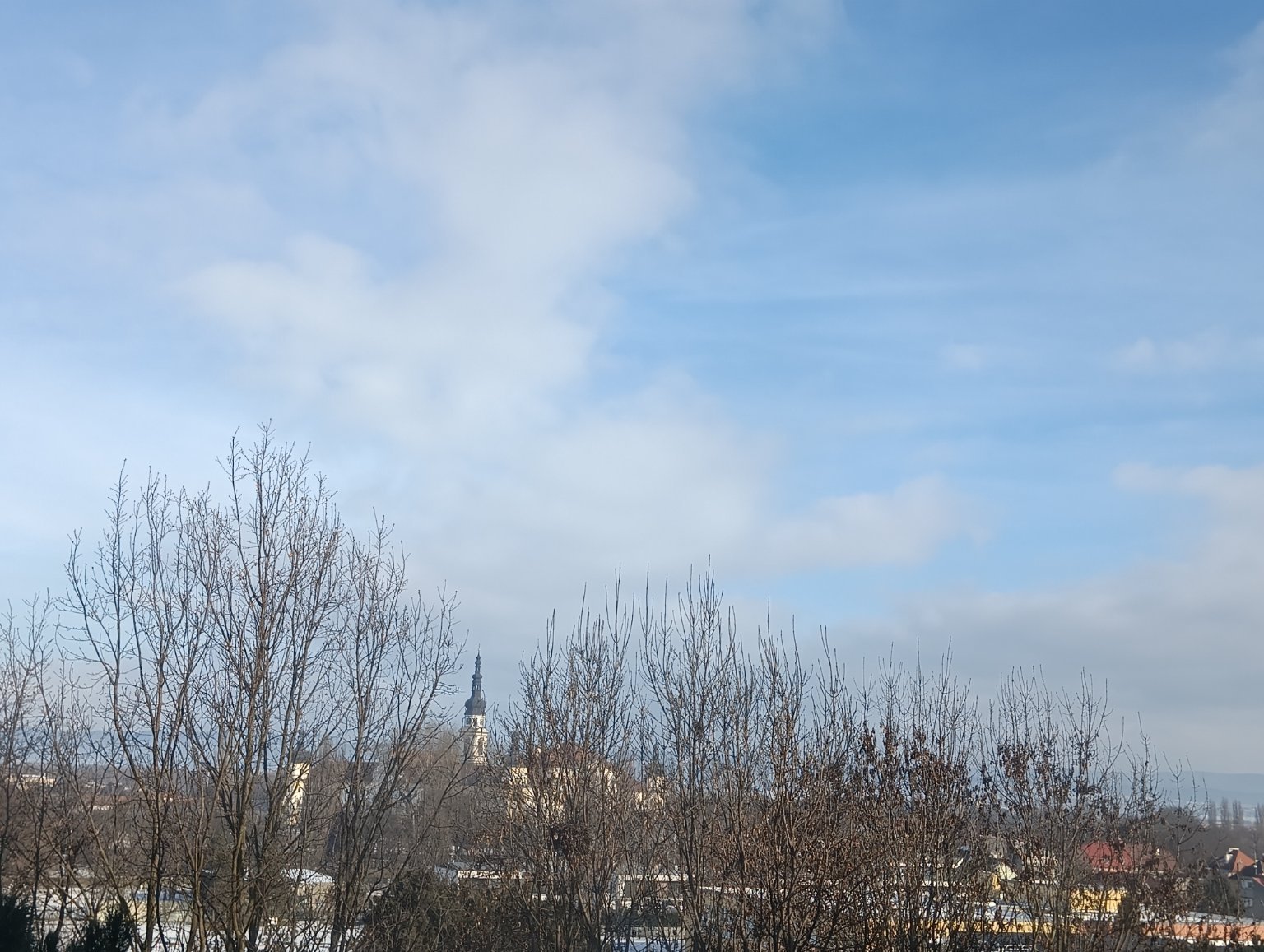 Oblačno, velmi slabé sněžení, vypadá to idylicky 😉, slabý SV. vítr, tlak 1017,9 hPa.