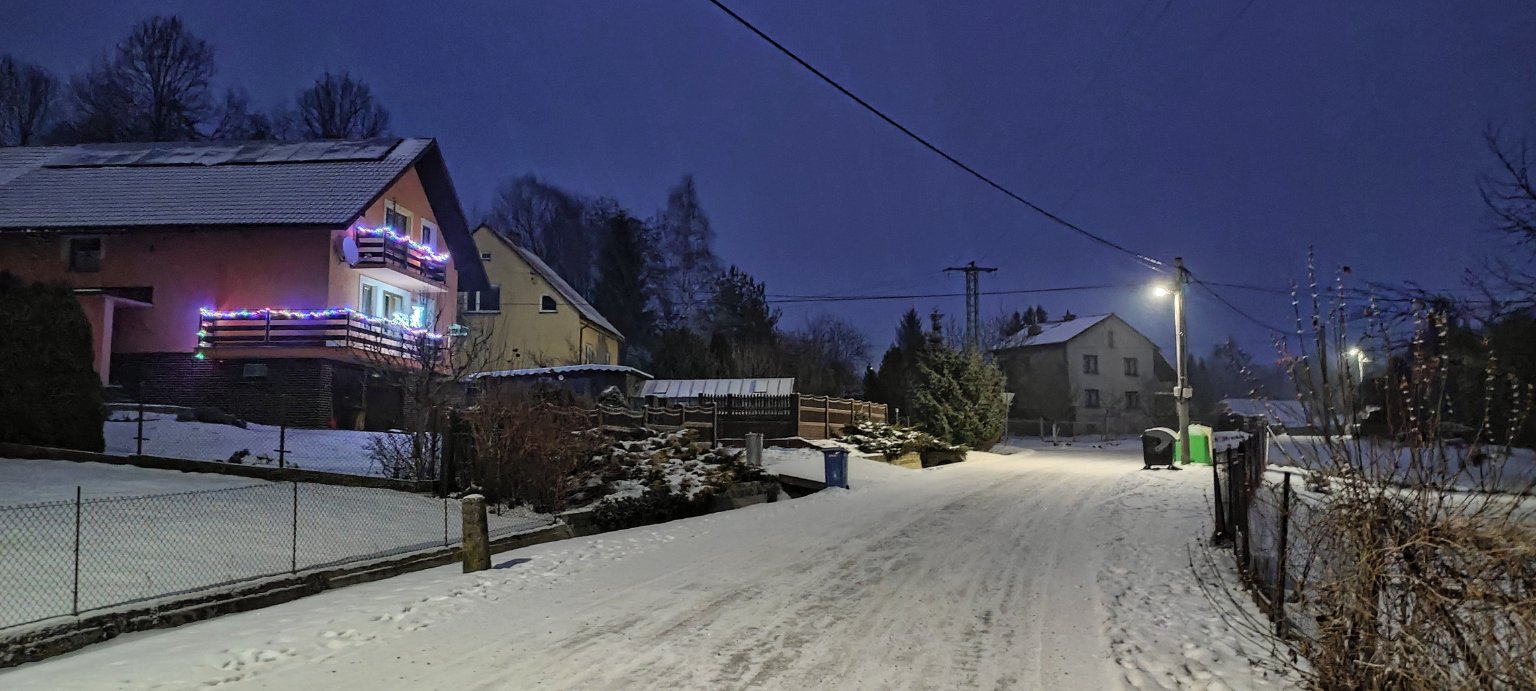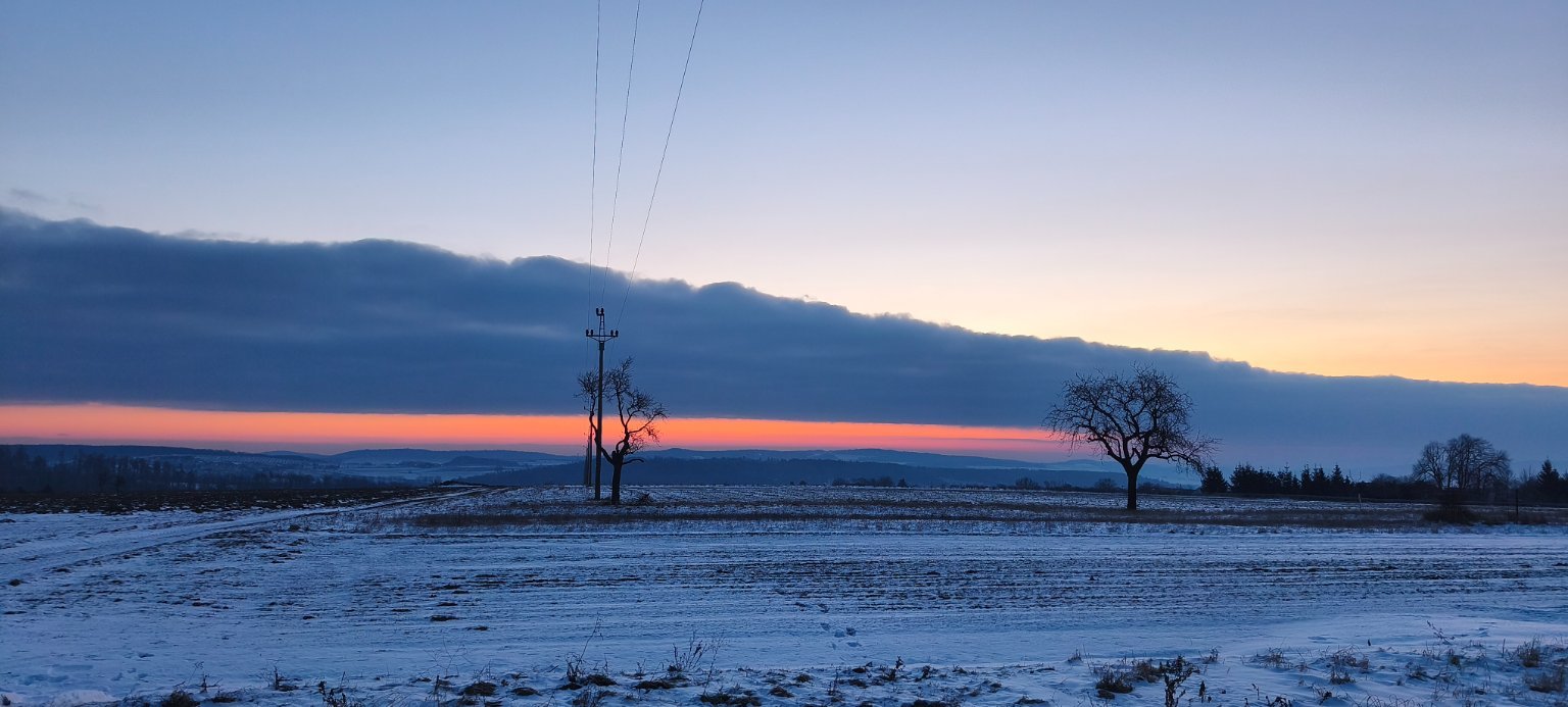 Slabé sněžení. Vánek (vznikl menší poprašek)