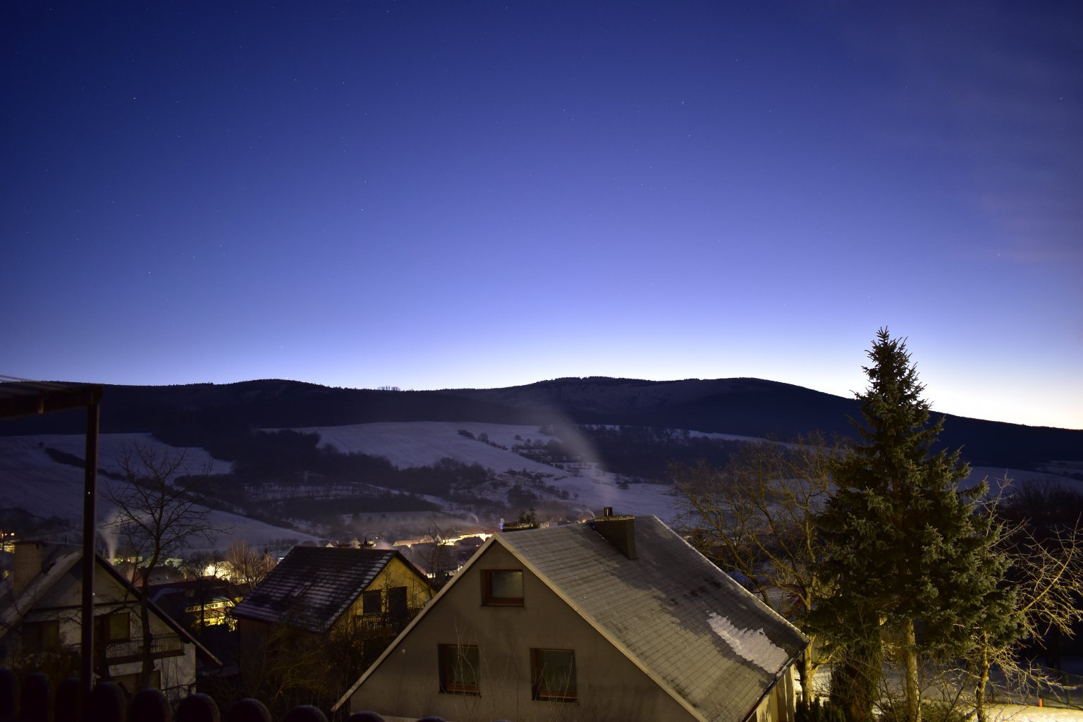 Skoro jasno. Bezvětří (velký mráz a ještě klesá)