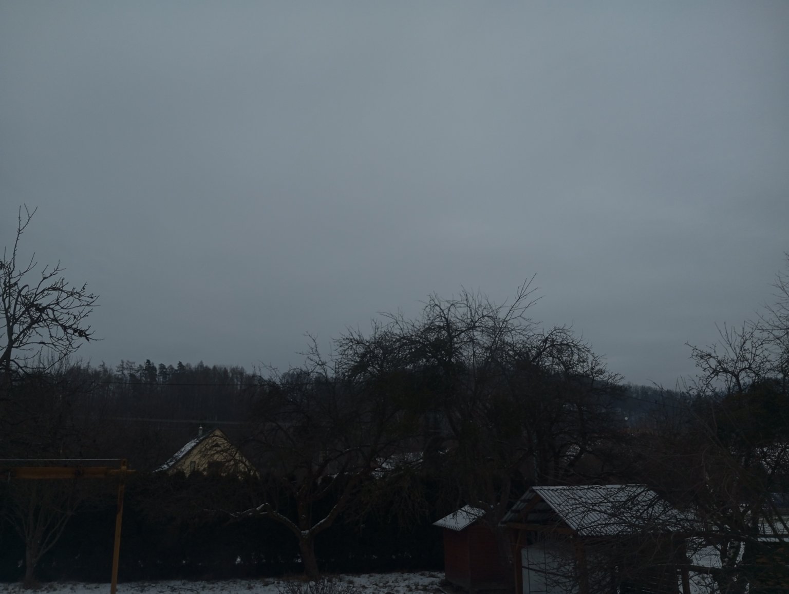 slabě sněží, světle zelené odrazy podjezd i když je vítr má tahat víc na sever. Ale nevadí, i tak z toho bude sypat