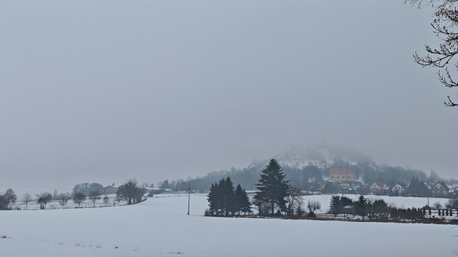Po dopoledním slabém dešti, kouřmo, mokrý, místy rozbředlý sníh, velmi slabý vítr jižních směrů, tlak 1020 hPa.