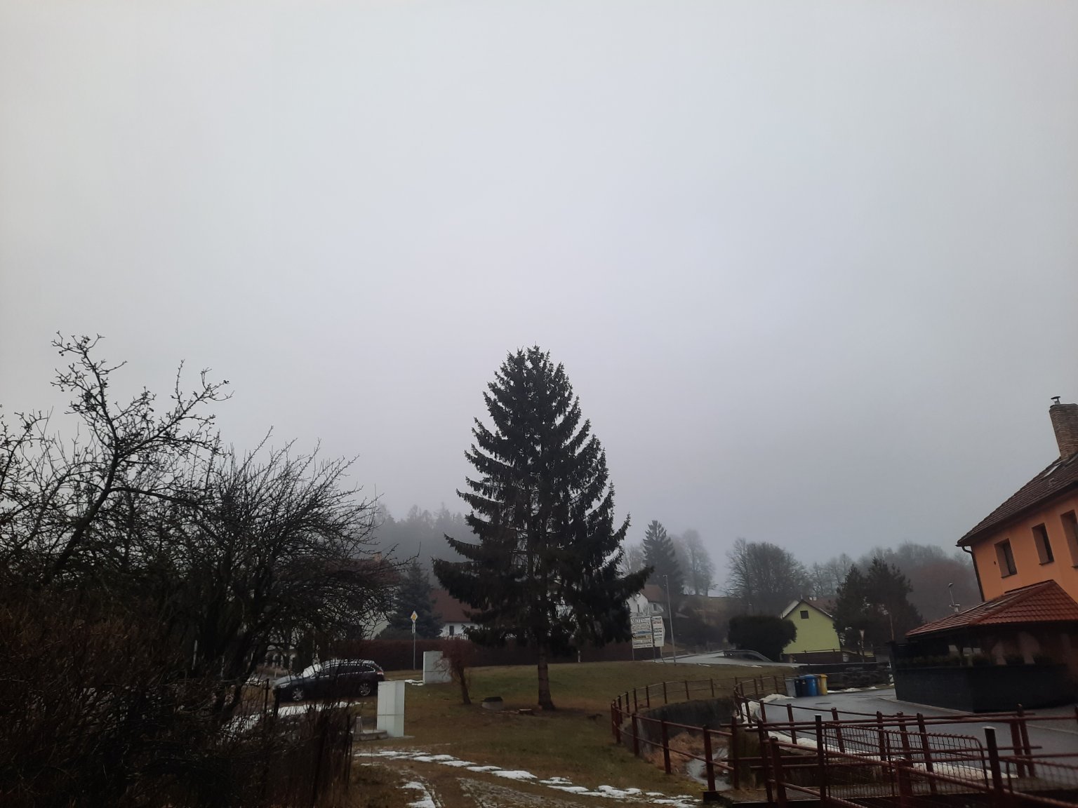 Hustá mlha, už začíná ale prosvítat slunce. Bezvětří