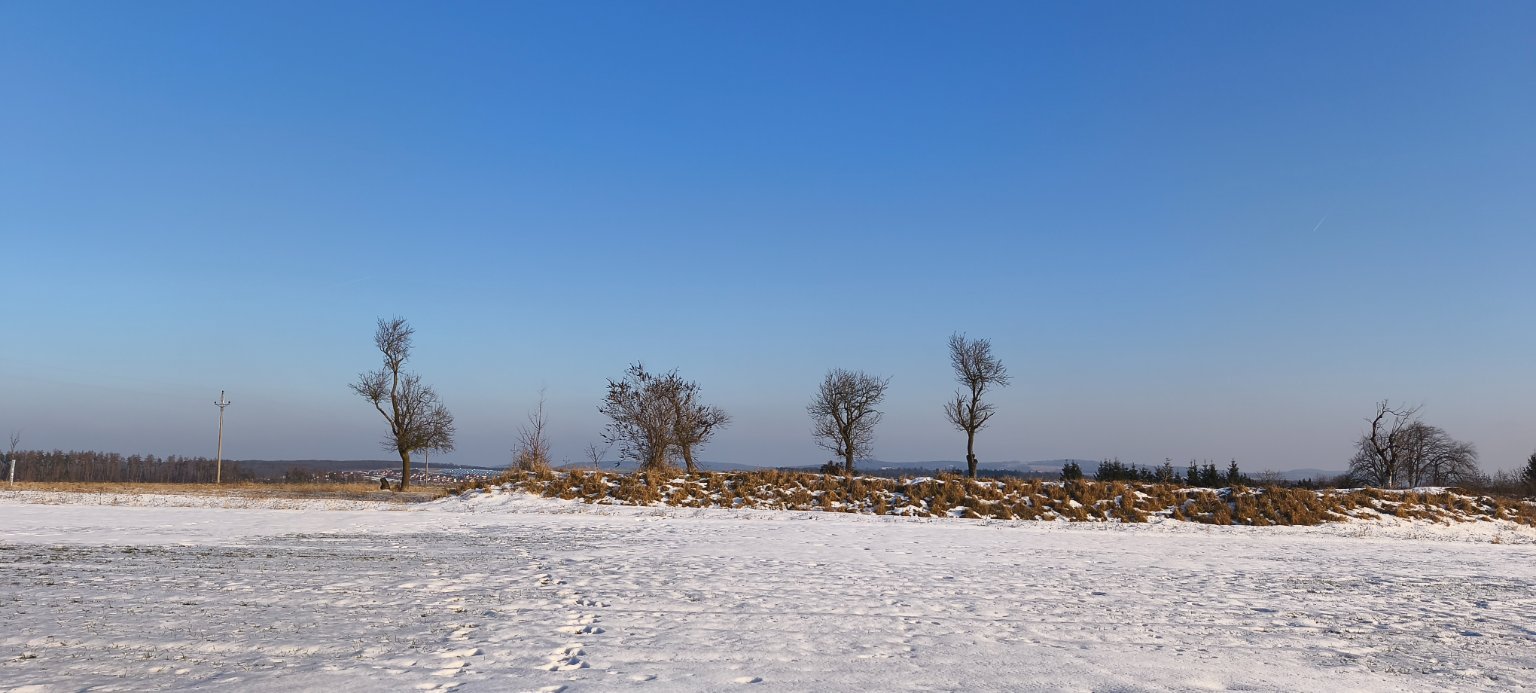 1,6°C, Jasno, Sníh: nesouvislý. Tak na zahradě už je to též nesouvislak, ale kolem potoka se to furt uplně v pohodě drží, do ochlazení to 100% vydrží..