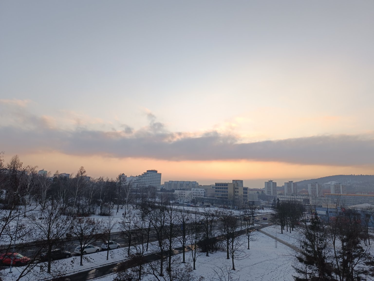 Jasno. Většinou vánek (sníh začíná být pomalu nesouvislý ale ještě drží. Cca 1 cm)