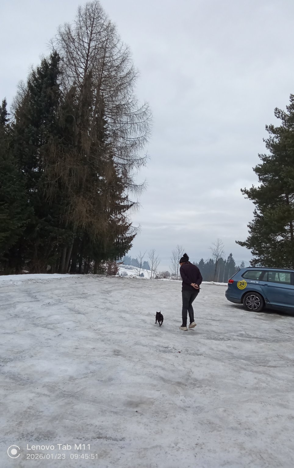 -°C, Velmi slabá mlha, Sníh: nesouvislý. Krásný výhled na Frýdek-Místek, kdyby teda nebyl ten smog... Tu na vrchu sníh nesouvislý, ale jinak fajný souvislak... Před chvilkou sněžilo..